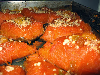 4. Тавата с готовата тиква се вади и парчета се обръщат. Наръсват се с начукани (не смлени) орехи, слага се МАЛКО!!! мед и се пъха обратно, за да се запекат орехите. Естествено медът се разтича по дъното на тавата, създавайки неуют за този, който трябва да я мие.